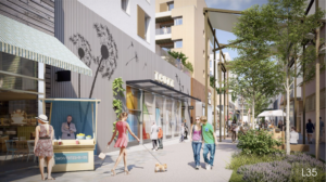 Au sein d’un axe commercial de 5 km, le projet vise également à créer les porosités de l’ensemble des îlots définis par le plan guide. Pour ce faire, un travail paysager sera mis en œuvre avec des espaces de promenade pour permettre de rythmer le nouveau parcours piéton.