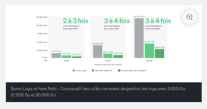 Le même comparatif des coûts de gestion des logs montre que Datadog peut être jusqu’à 4 fois plus cher que New Relic.